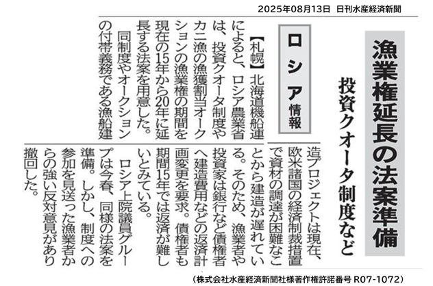 «Российское правительство сосредоточено на оживлении рыбной промышленности для развития своего Дальнего Востока. Ожидается, что присутствие российской продукции (в Японии) в будущем увеличится, поскольку производство в Соединенных Штатах продолжает сокращаться», — пояснил Сейдзи Харагути, директор Федерации кооперативного тралового рыболовства Хоккайдо.