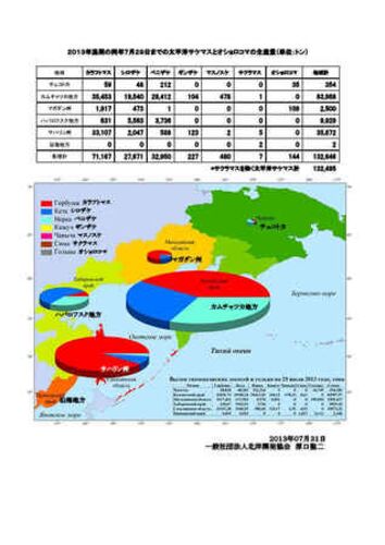 2013年7月31日 一般社団法人北洋開発協会 [2013年漁期の同年7月29日までの太平洋サケマスとオショロコマの生産量] マガダン海洋漁業研究所マグニロは、2013年漁期の同年7月29日までの太平洋サケマスとオショロコマの生産量を発表した。