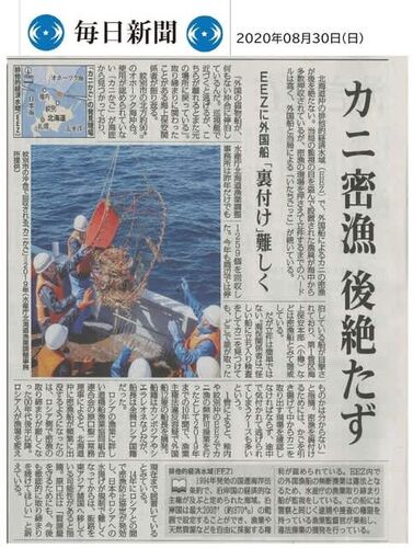 2020年08月14日産経新聞[外国船のカニ密漁 横行 北海道沖 立件にはハードル]北海道沖の排他的経済水域(EEZ)で、外国船によるカニの密漁が後を絶たない。当局の監視の目を盗んで設置された漁具が海中から多数押収されているが、密漁の現場を押さ…