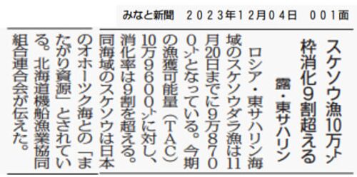 ロシア漁業者 東サハリン海域 ”日本EEZまたがり資源”スケトウダラ 10万トン生産 日刊みなと新聞