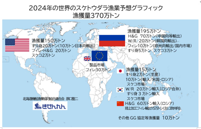 2024-03-09 2024年の世界のスケトウダラ漁業予想グラフィック 北海道機船漁業協同組合連合会 原口聖二 日記 2024年03月09日 北海道機船漁業協同組合連合会 原口聖二 [2024年の世界のスケトウダラ漁業予想グラフィック 原口聖二] 北海道機船漁業協同組合連合会の報告担当者:原口聖二は、天然魚単一魚種において世界最大生産量となるスケトウダラの今年2024年の漁業予想グラフィックを作成した。 同年の当該漁業の総漁獲量を370万トンと予想する。