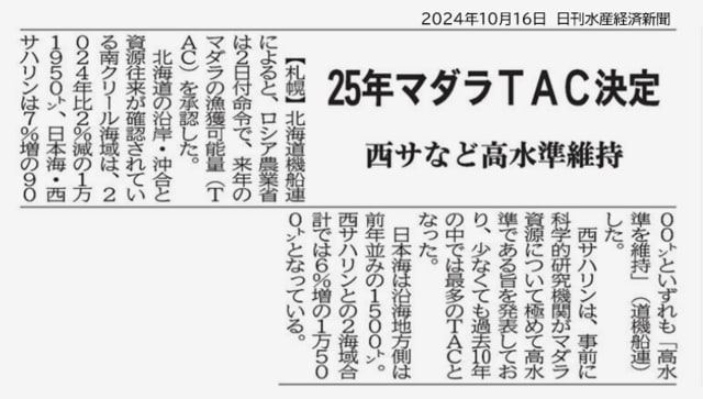 ロシア 2025年マダラTAC 北海道接続西サハリン・南クリール海域高水準 日刊水産経済新聞