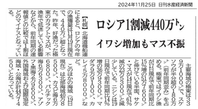 2024年 ロシア漁業1割減440万トン(11月19日)イワシ増加もマス不振 日刊水産経済新聞