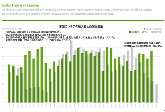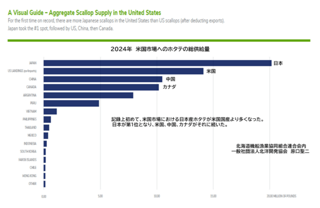 昨年2024年、米国市場へのホタテの総供給量において、記録上初めて、日本からの輸入(殻なし製品5,389トン)が米国国産(輸出を除く)より多くなった。