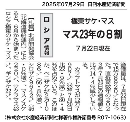 ロシア 極東サケマス マス23年の8割 7月22日現在 日刊水産経済新聞(株式会社水産経済新聞社様著作権許諾番号R07-1063)